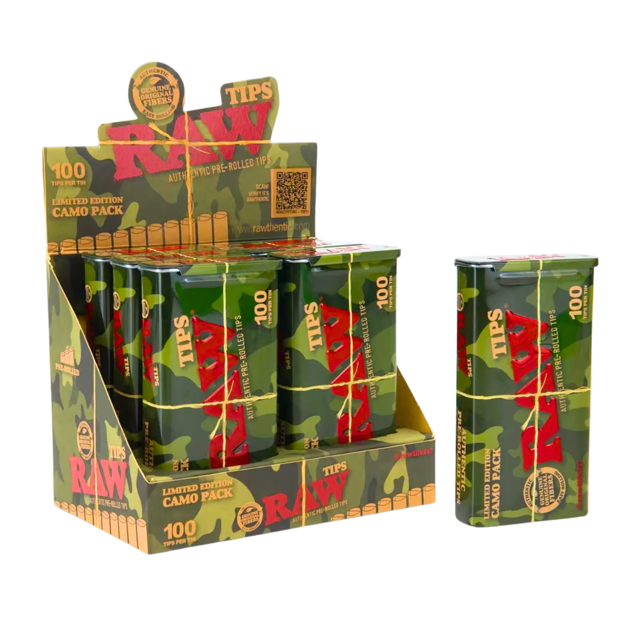 RAW TIPS | PRE-ROLLED CAMO TIPS TIN 100PK -6 COUNT BOX